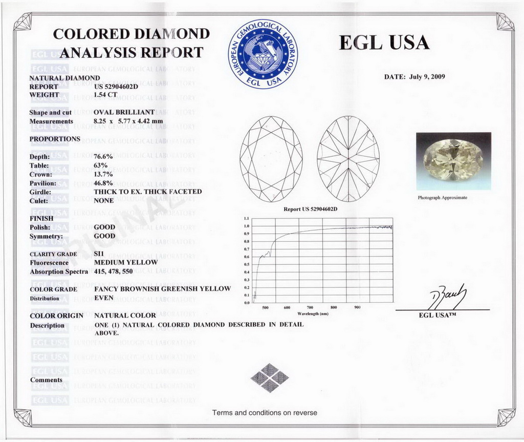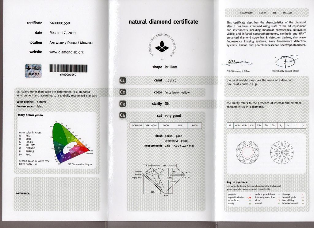 Certifikát, který je často označován jako „5. C“ (Color, Clarity, Cut, Carat, Certificate), je nedílnou součástí diamantu nebo drahého kamenu. Certifikát obsahuje veškeré informace o daném kameni. Patří mezi ně například váha, barva, čistota, rozměry, parametry brusu, symetrie a leštění, informace o florescence a dodatečných úpravách.